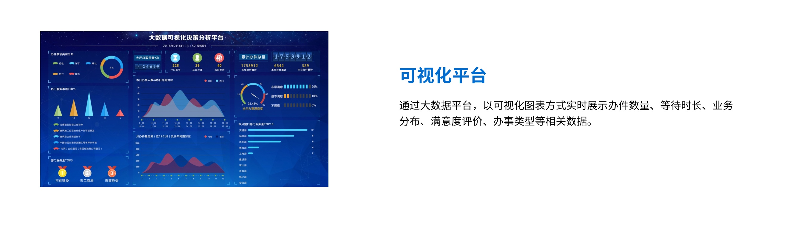 智慧政務大廳綜合解決方案基于“以公眾服務為中心”的理念,將移動互聯網、物聯網、云計算、5G 無線等技術應用到政府公共服務之中,建設“渠道多、辦事易、效率高”的綜合服務體系,為公眾帶來全新的服務體驗,提高公眾對政府公共服務的滿意度。