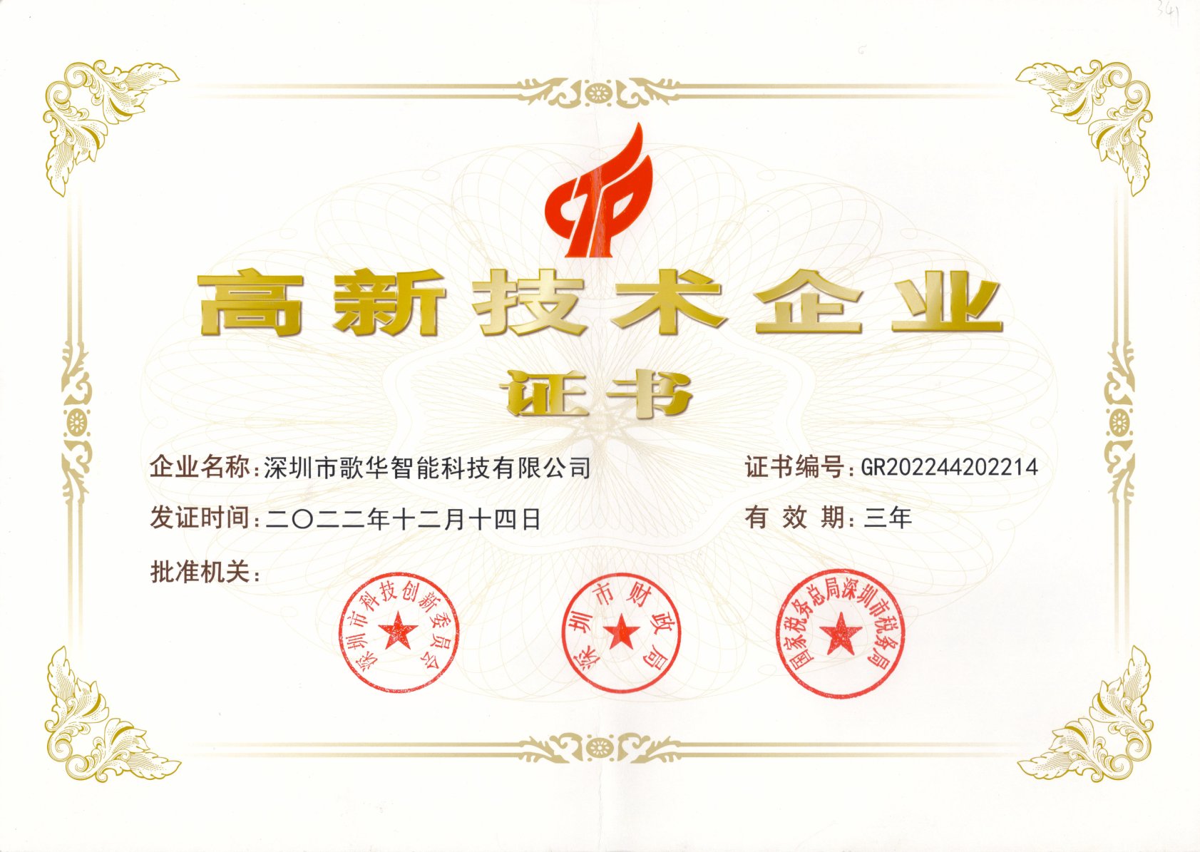 國(guó)家級(jí)高新技術(shù)企業(yè)證書